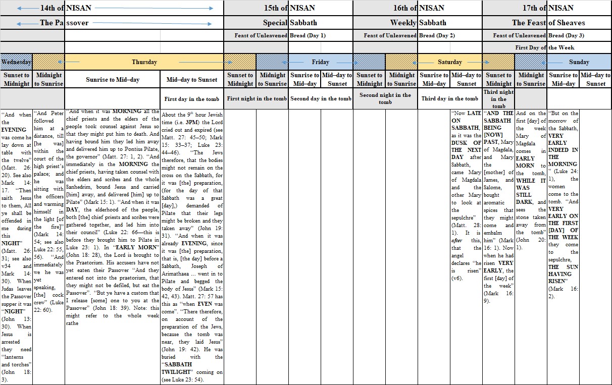 Into all this, we need to insert the more specific expression used in Matt. 12: 40: “For even as Jonas was in the belly of the great fish three days and three nights, thus shall the Son of man be in the heart of the earth three days and three nights” (see Jonah 1: 17).[41] Now there is no requirement for these to be whole days or whole nights, but there must at least be parts of three separate days and parts of three separate nights.[42] I believe that the Lord was buried on the 14th, before sunset,[43] and therefore during the daytime. Counting the 14th as a day therefore, we have: